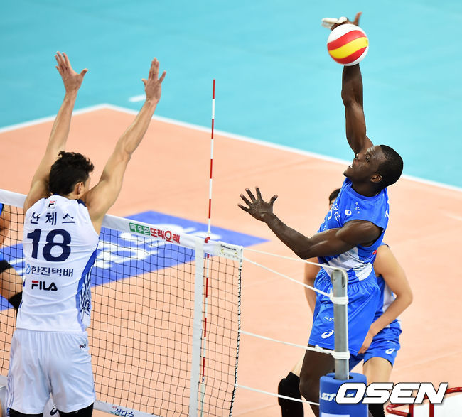 29일 오후 인천 계양체육관에서 열린 '2014-2015 NH농협 V-리그' 남자부 대한항공 점보스와 우리카드 한새의 경기, 우리카드 까메호가 강타를 날리고 있다.