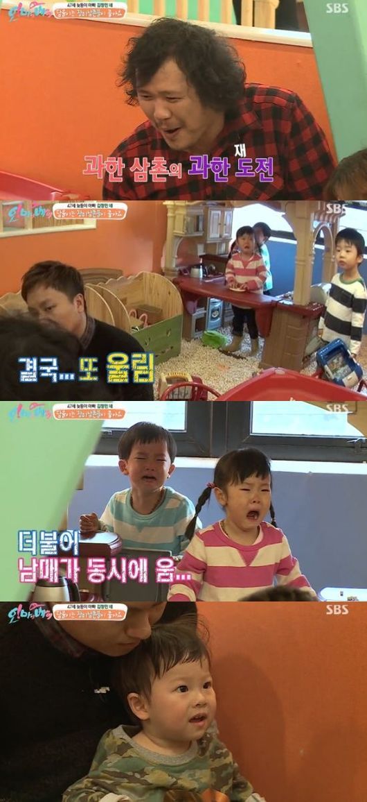 육중완은 29일 오후 방송된 SBS 예능프로그램 '오 마이 베이비'에서 김정민의 아들 담율이와 함께 찾은 키즈카페 안 다른 아이들을 울렸다. 원인은 그의 뽀로로 흉내였다.