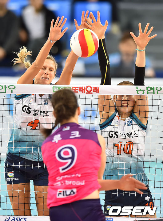 29일 오후 인천 계양체육관에서 열린 '2014-2015 NH농협 V-리그' 여자부 흥국생명과 GS칼텍스의 경기, GS칼텍스 쎄라가 흥국생명 루크의 강타를 막아내고 있다.