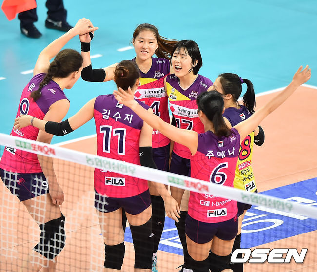 29일 오후 인천 계양체육관에서 열린 '2014-2015 NH농협 V-리그' 여자부 흥국생명과 GS칼텍스의 경기, 공격에 성공한 흥국생명 선수들이 기쁨을 나누고 있다.