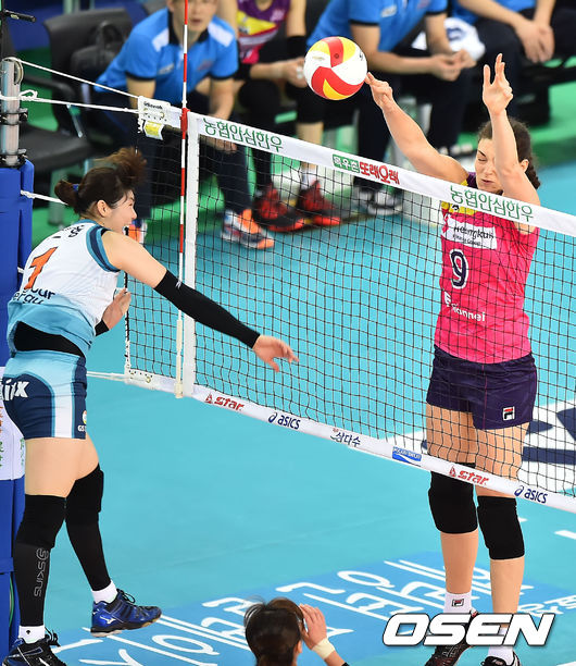 29일 오후 인천 계양체육관에서 열린 '2014-2015 NH농협 V-리그' 여자부 흥국생명과 GS칼텍스의 경기, GS칼텍스 이소영의 강타를 흥국생명 루크가 블로킹하고 있다.