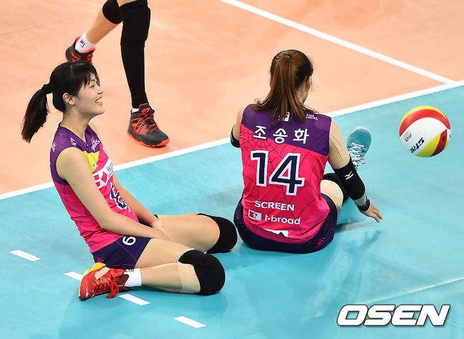 29일 오후 인천 계양체육관에서 열린 '2014-2015 NH농협 V-리그' 여자부 흥국생명과 GS칼텍스의 경기, 흥국생명 조송화와 주예나가 볼을 받아내지 못한 후 아쉬워하고 있다.