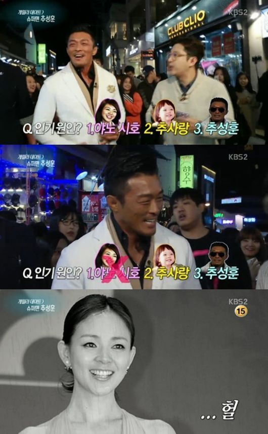 이날 추성훈은 인기 비결을 물으며 본인과 야노 시호, 추사랑 등의 보기를 주자 “나와 추사랑 때문이다”라고 아내 야노 시호를 빼놓는 모습으로 웃음을 자아냈다.