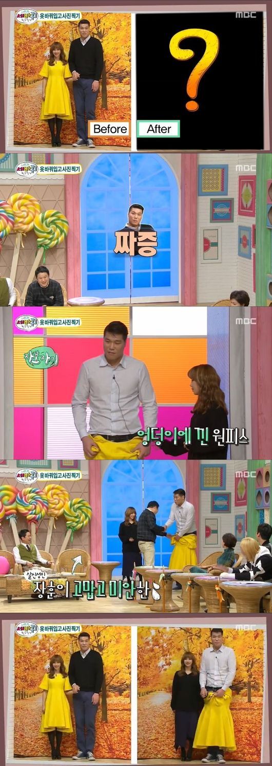 그러나 결국 이유리와 옷 바꿔입기를 하게 된 그는 이내 이유리의 원피스를 자신의 몸에 반 정도 입은 채 등장해 웃음을 자아냈다.