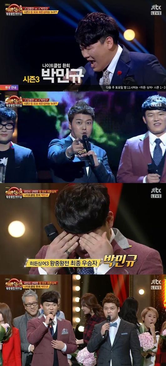 우승은 생방송 문자투표 총 56여만표에서 무려 21만표를 넘어선 박민규에게로 돌아갔다. 과거 '히든싱어3' 환희 편에 출연했다가 수많은 악플에 직면했다가 주저할 뻔 했던 순간, 아버지가 건넨 자신의 방송출연 영상 편집본을 보고 다시 한 번 마음을 다잡고 연습을 거듭해 얻어낸 노력과 반전의 결과였다.