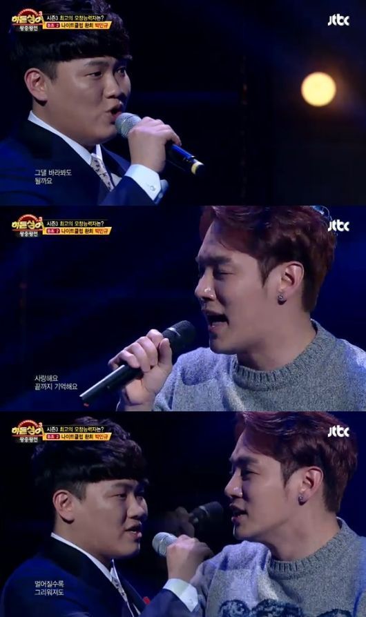 지난 29일 방송된 종편채널 JTBC ‘히든싱어3 왕중왕전’은 실력파 모창자 중 ‘킹 오브 히든싱어’를 뽑기 위한 TOP4의 파이널 생방송 무대가 펼쳐졌다. 이날 환희가 미국 공연으로 불참한 가운데 환희 모창자 박민규는 ‘투마로우’를 선곡해 열창했다.