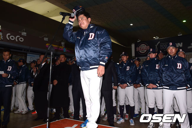 30일 서울 잠실구장에서 열린 두산 베어스의 '2014 곰들의 모임' 환담회에서 김태형 감독이 팬들에게 인사를 하고 있다
