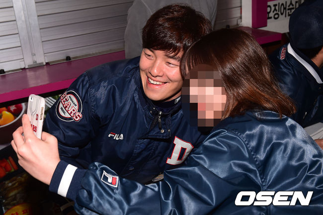 30일 서울 잠실구장에서 열린 두산 베어스의 '2014 곰들의 모임' 환담회에서 민병헌이 팬들과 셀카를 찍고 있다.