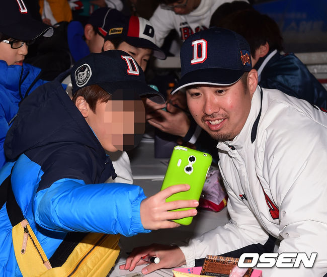 30일 서울 잠실구장에서 열린 두산 베어스의 '2014 곰들의 모임' 환담회에서 유희관이 팬들과 사진을 찍고 있다.