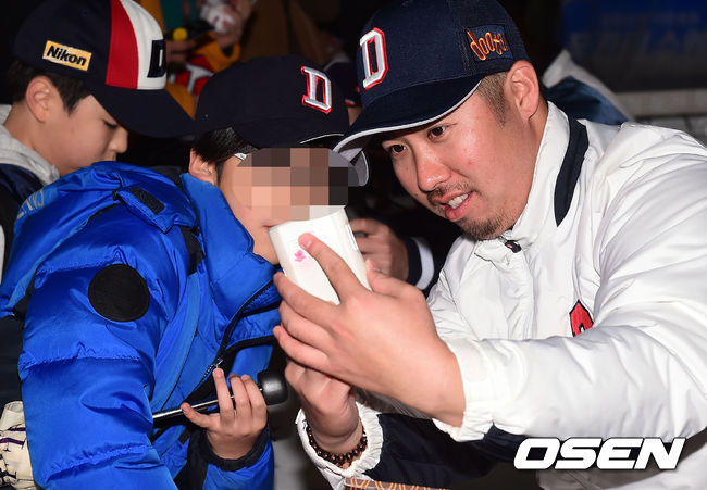 30일 서울 잠실구장에서 열린 두산 베어스의 '2014 곰들의 모임' 환담회에서 유희관이 팬들과 사진을 찍고 있다.