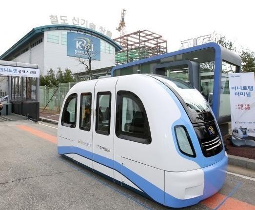 국산 미니 트램은 세계 최초 원격호출과 수직이동이 가능한 무인자동으로 알려지고 있다. 한국 과학 기술의 쾌거.