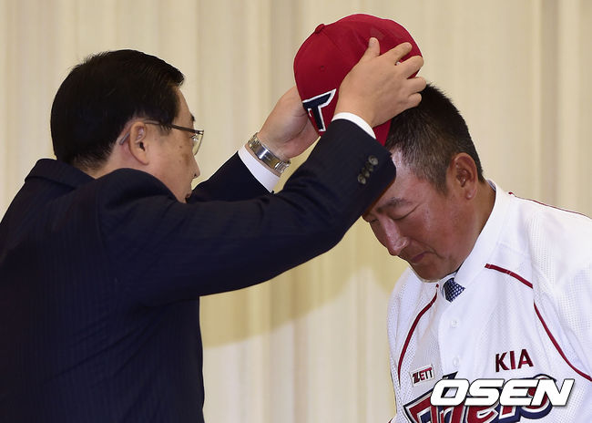 박찬우 사장이 김기태 신임 감독에게 모자를 씌워주고 있다.