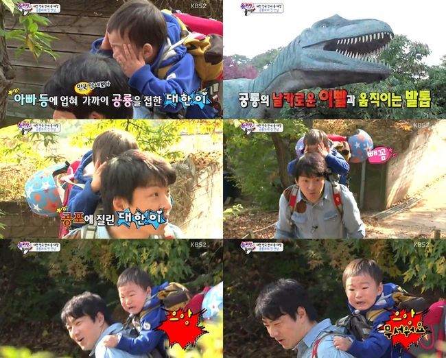 이날 방송에서 대한은 아빠 송일국의 등에 업혀 공룡을 만났다. 날카로운 이빨에 긴 발톱을 가진 공룡을 본 대한은 아빠 등에서 울음을 터뜨리며 "공룡 무서워요"라고 소리쳐 눈길을 끌었다.