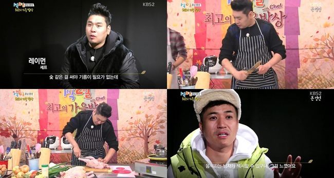 이날 레이먼 킴 팀은 샘 킴의 팀과 최고의 가을 밥상 대결을 벌였고 가장 먼저 요리 시작에 나선 레이먼 킴을 본 김종민은 "요리하는 남자가 섹시하다는 것을 알 수 있었다"고 말했다.