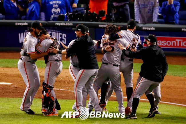 월드시리즈 7차전에서 우승을 확정지은 후 기뻐하는 샌프란시스코 자이언츠 선수들. 샌프란시스코는 3루수 파블로 산도발이 FA로 떠난 뒤 뚜렷한 전력 보강을 이뤄지내 못하고 있다. ⓒAFPBBNews = News1(무단전재 및 재배포 금지)