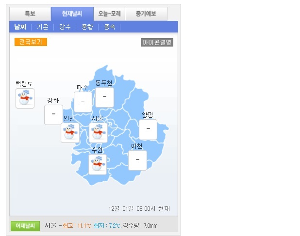 한편 12월 서울 첫 눈이 내린 오늘, 서울의 낮 기온은 –2도, 대구 7도, 대전 5도 등을 기록할 것으로 예상된다.