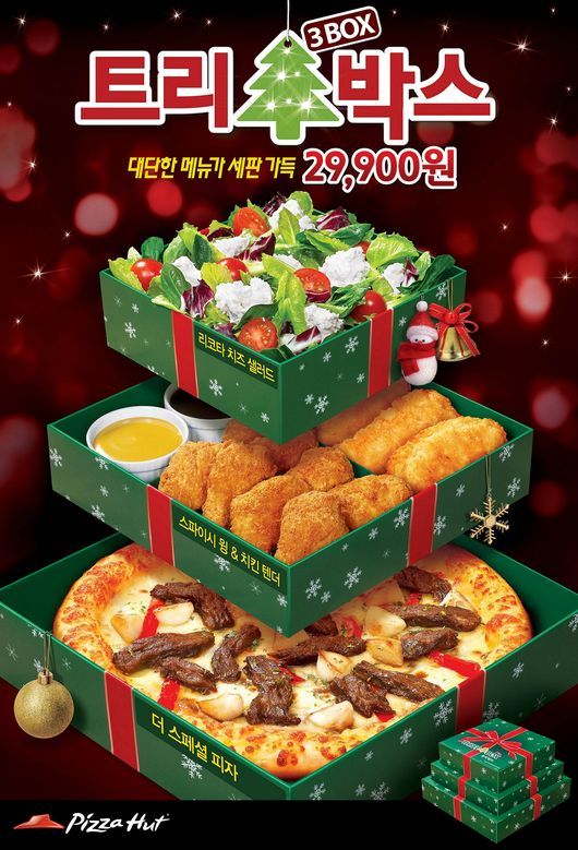 트리박스는 크리스마스 트리를 연상시키는 녹색 박스의 삼단 구성으로 피자와 치킨, 샐러드까지 세 가지 요리를 한 번에 즐길 수 있는 것이 특징이다. 내년 1월 31일까지 한정 판매되는 스페셜 에디션.