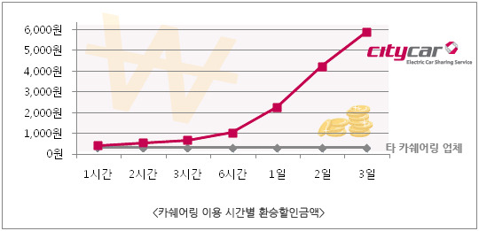 전기차가 아닌 일반 차량으로 나눔카 서비스를 하고 있는 타 쉐어링업체의 경우에는 1회 대여 시마다 300원씩을 포인트로 적립해 주고 있다. 하지만 100% 전기차로 운영되고 있는 씨티카의 경우는 이용 후 대여요금의 3%를 직접 할인 받을 수 있어, 평균 약 1000원, 최대 5616원까지 결제 시 할인 받을 수 있다.