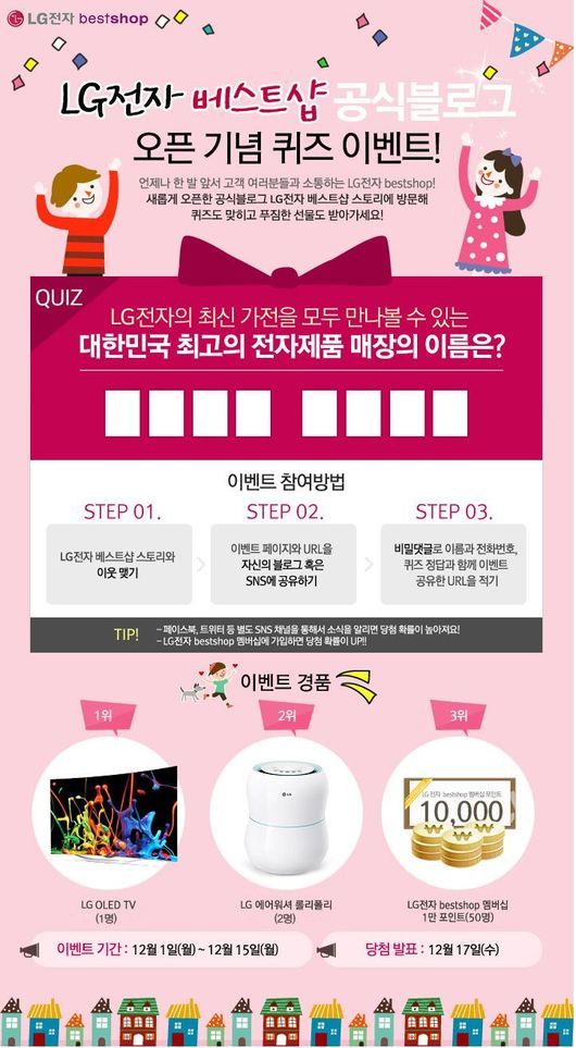 LG전자는 'LG전자 베스트샵 스토리' 오픈을 기념해 최신 가전제품과 베스트샵 포인트를 받을 수 있는 이벤트도 진행한다. 15일까지 진행되는 퀴즈이벤트는 LG전자 베스트샵 공식 블로그와 이웃을 맺고 본인의 블로그에 해당 이벤트 페이지를 스크랩하면 참여할 수 있다. 추첨을 통해 1등 1명에 LG OLED TV, 2등 2명에게 LG 에어워셔 롤리폴리, 3등 50명에게 LG전자 베스트샵 멤버십 1만포인트 등이 제공된다.