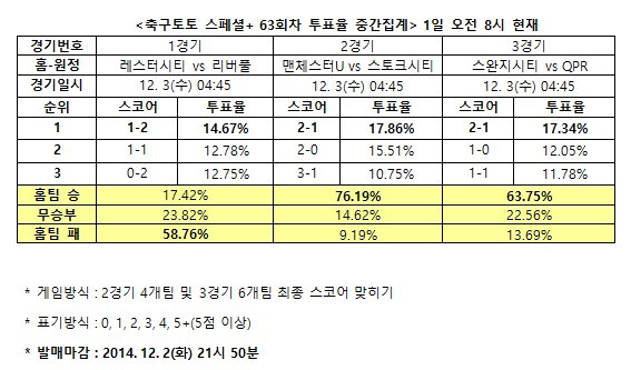 2014-15 잉글랜드 프리미어리그 3경기 대상 축구토토 스페셜+ 63회차 투표율 중간집계 결과
