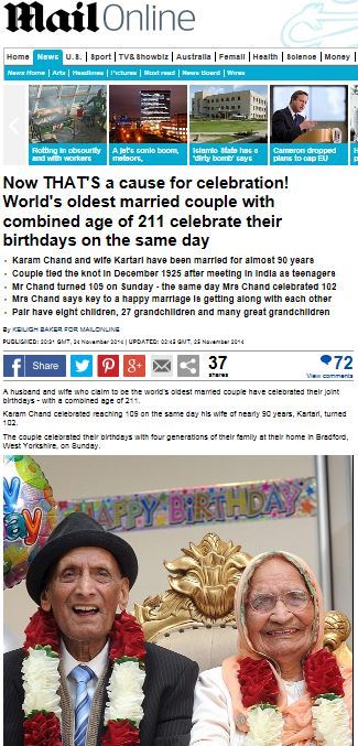 나란히 생일을 맞은 부부는 인도의 카람 찬드(109)와 카타리 찬드(102) 부부로, 결혼 89년째를 맞았다.