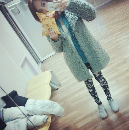 공개된 사진 속 니콜은 과자를 든 채 거울에 비친 자신의 모습을 카메라로 찍고 있는 모습이다. 특히 그는 화려한 패턴의 레깅스와 복슬복슬한 털 장식의 가디건으로 남다른 패션 감각을 뽐내고 있어 눈길을 끈다.