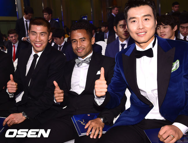 1일 오후 서울 서대문구 홍은동 그랜드힐튼호텔 컨벤션센터에서 열린 '2014 현대오일뱅크 K리그 대상' 시상식에서 차두리와 산토스, 이동국이 포즈를 취하고 있다.