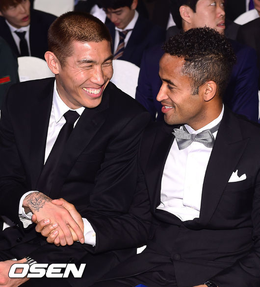 1일 오후 서울 서대문구 홍은동 그랜드힐튼호텔 컨벤션센터에서 열린 '2014 현대오일뱅크 K리그 대상' 시상식에서 차두리와 산토스, 이동국이 포즈를 취하고 있다.