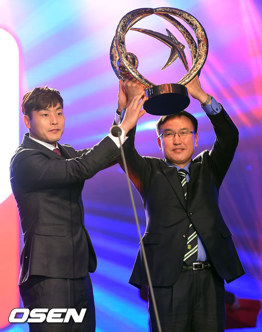 1일 오후 서울 서대문구 홍은동 그랜드힐튼호텔 컨벤션센터에서 열린 '2014 현대오일뱅크 K리그 대상' 시상식,전북 이철근 단장과 권순태가 우승 트로피를 번쩍 들어올리고 있다.