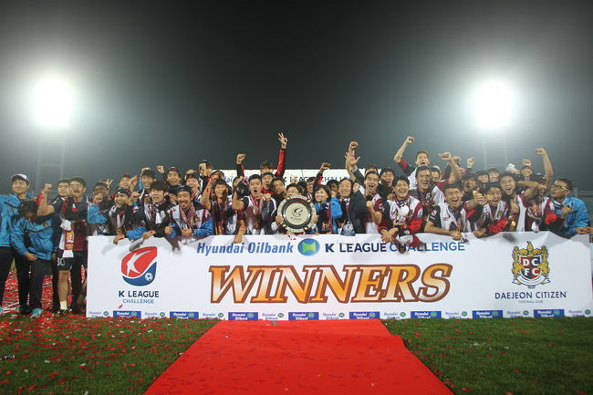 대전은 올 시즌 챌린지 정상에 오르며 강등 1년 만에 승격의 꿈을 이뤘다. 조진호 감독의 지도력과 득점왕 아드리아노, 2014 인천아시안게임 금메달 주역 임창우 등이 우승을 합작했다.