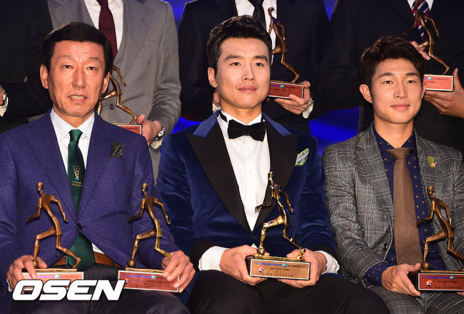 1일 오후 서울 서대문구 홍은동 그랜드힐튼호텔 컨벤션센터에서 열린 '2014 현대오일뱅크 K리그 대상' 시상식 , 수상자들이 포즈를 취하고 있다