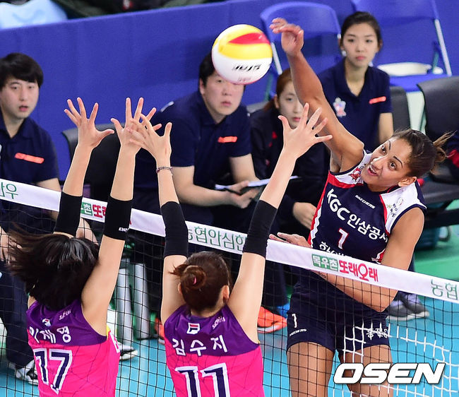 1일 오후 인천 계양체육관에서 열린 '2014-2015 NH농협 V-리그' 흥국생명과 인삼공사의 경기 2세트 조이스가 공격을 시도하고 있다.