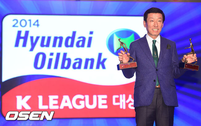 1일 오후 서울 서대문구 홍은동 그랜드힐튼호텔 컨벤션센터에서 열린 '2014 현대오일뱅크 K리그 대상' 시상식,최강희 감독이 트로피를 들고 포즈를 취하고 있다.