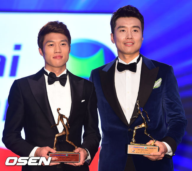 1일 오후 서울 서대문구 홍은동 그랜드힐튼호텔 컨벤션센터에서 열린 '2014 현대오일뱅크 K리그 대상' 시상식, 영플레이어상 김승대와 MVP 이동국이 포즈를 취하고 있다