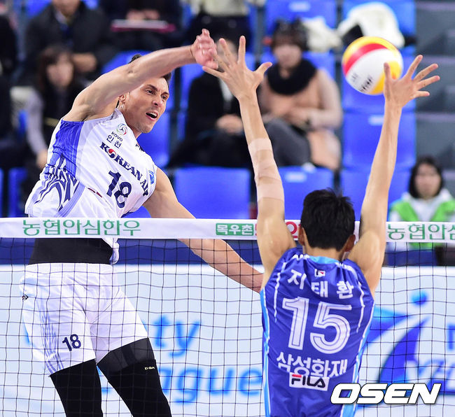 1일 오후 인천 계양체육관에서 열린 '2014-2015 NH농협 V-리그' 대한항공과 삼성화재의 경기 1세트 산체스가 공격을 시도하고 있다.