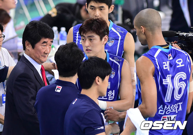 1일 오후 인천 계양체육관에서 열린 '2014-2015 NH농협 V-리그' 대한항공과 삼성화재의 경기 1세트 신치용 감독이 작전 타임을 갖고 있다.