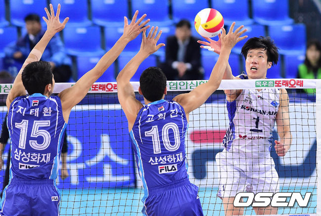 1일 오후 인천 계양체육관에서 열린 '2014-2015 NH농협 V-리그' 대한항공과 삼성화재의 경기 1세트 신영수가 공격을 시도하고 있다.