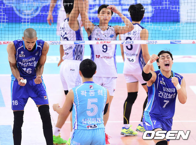 1일 오후 인천 계양체육관에서 열린 '2014-2015 NH농협 V-리그' 대한항공과 삼성화재의 경기 1세트 삼성화재 선수들이 득점 후 기뻐하고 있다.