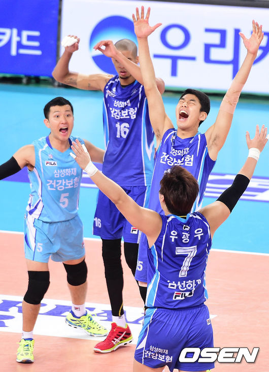 1일 오후 인천 계양체육관에서 열린 '2014-2015 NH농협 V-리그' 대한항공과 삼성화재의 경기 종료 후 종료 후 삼성화재 선수들이 환호하고 있다.