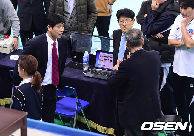 1일 오후 인천 계양체육관에서 열린 '2014-2015 NH농협 V-리그' 대한항공과 삼성화재의 경기 종료 후 대한항공 김종민 감독이 경기 중 있었던 내용에대해 경기 운영진에게 항의를 하고 있다.