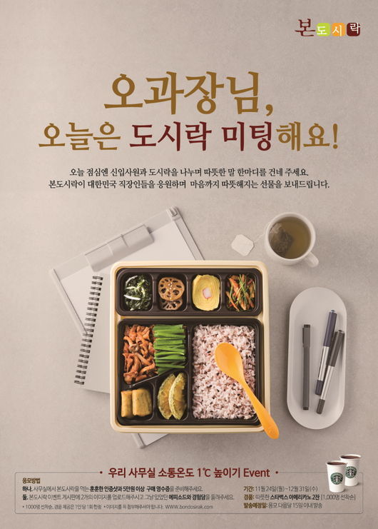 프리미엄 한식 도시락 브랜드 본도시락(대표 김철호)은 도시락을 구매하는 직장인 1000명에게 따뜻한 커피를 선물한다. 사무실에서 본도시락을 먹는 모습을 사진으로 찍어 5만 원 이상 구매 영수증, 재미있는 사연과 함께 본도시락 홈페이지(http://www.bondosirak.co.kr) 이벤트 게시판에 올리면 자동 참여된다.