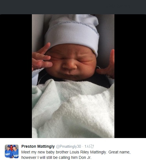LA 다저스 돈 매팅리 감독의 늦둥이 아들 사진이 공개 됐다. 매팅리 감독의 아들인 프리스톤 매팅리는 2일(이하 한국시간) 자신의 트위터에 ‘새로 태어난 아기 형제 루이스 릴리 매팅리를 만나보세요. 좋은 이름이기는 하지만 나는 아직도 아기를 돈 주니어라고 부른답니다’라는 맨션과 함께 생후 사흘이 지난 아이의 사진을 공개했다.