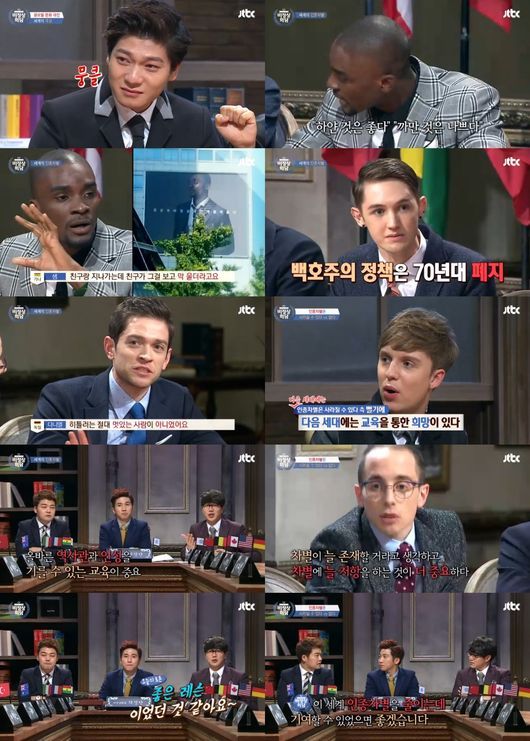 이날 방송에서 G10의 이야기는 생각의 변화를 이끌어냈다. 가나 대표 샘 오취리는 “어렸을 때 가나에서 그렇게 배웠다. ‘하얀 건 좋다. 까만 건 나쁘다’. 식민지 시절 백인들을 신처럼 대했기 때문에 가나에서도 사람들끼리 피부 하얀 사람을 선호한다”며 “한국에서도 방송을 하는데 맨 앞에는 백인이 서고, 배경에는 흑인이 선다. 흑인 친구들이 메시지를 보낸다. 한국 문화에 관심이 많은데 흑인에 대한 이미지 때문에 한국에 오기 겁난다는 말을 많이 한다”고 말했다. 전혀 예상하지 못했던 이야기였고 샘의 친구가 동대문에 크게 걸려있는 샘의 사진을 보고 눈물을 흘렸다는 사연은 우리를 다시 한 번 돌아보게 했다.