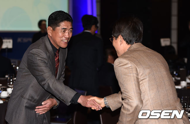 KT 조범현 감독이 김인 삼성 라이온즈 사장과 인사를 나누고 있다.