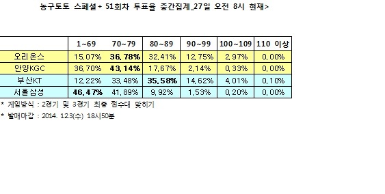 2014-15시즌 KBL 2경기 대상 농구토토 스페셜+ 51회차 투표율 중간집계 결과