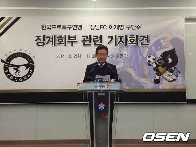 이재명 성남시장은 2일 오전 성남시청에서 기자회견을 열고 한국프로축구연맹의 징계위원회 회부에 대한 입장을 표명했다. 이 자리서 이 시장은 “프로축구연맹의 징계회부는 부당하다. 헌법 원칙에도 위반된다. AFC나 FIFA에도 이런 조항은 없다. 헌법 소원이나 소송도 불사하겠다”고 강경책을 발표했다.