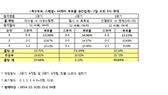 2014-15 잉글랜드 프리미어리그 3경기 대상 축구토토 스페셜+ 64회차 투표율 중간집계 결과