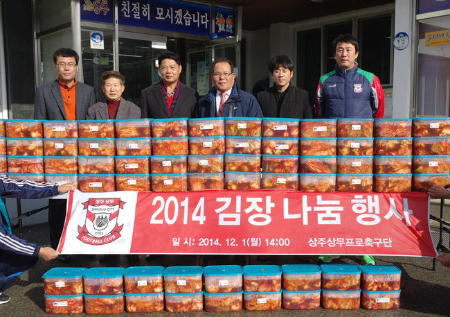주말 동안 청리면 소재 유소년 숙소에서 담근 김치를 청리면에 전달하는 2014 김장 나눔 행사를 진행했다. 이번 김장 나눔은 3년째 이어오는 행사이며, 노인 비율이 높은 상주시 특성상 혼자 거주하시는 어르신들에게는 꼭 필요한 나눔이기도 하다. 상주상무는 올 한해 지역민들에게 받은 사랑과 성원에 대한 감사함을 전하고자 나눔 행사를 진행하였다.