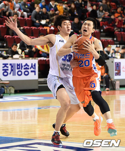 1쿼터 전자랜드 정영삼이 KCC 정희재와 충돌하고 있다.