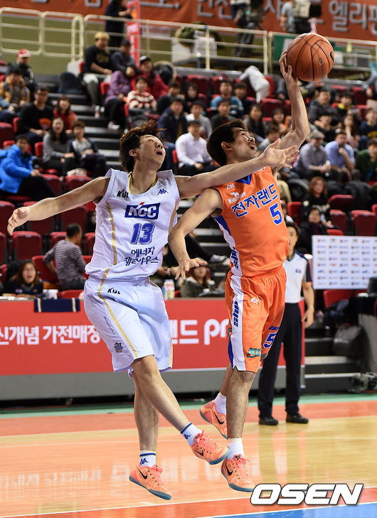 3쿼터 KCC 김지후와 전자랜드 정병국이 리바운드 다툼을 하고 있다.